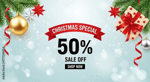 Get 50% off this Christmas with festive holiday ornaments and a gift box surrounded by falling snow for a magical shopping experience