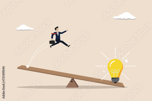 Get new business idea, creativity or invention, wisdom to drive success concept, businessman jump on seesaw with lightbulb.
