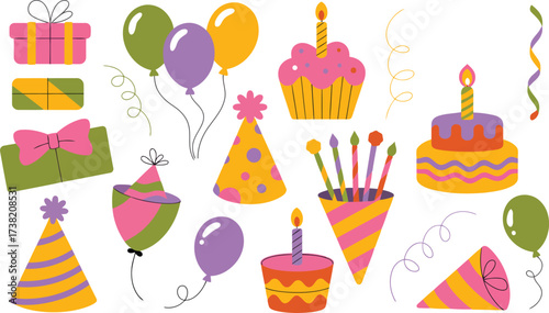 Get the Party Started with Fun Birthday Elements Featuring Festive Balloons, Cakes, Gifts, Candles and Party Hats For a Joyful Celebration