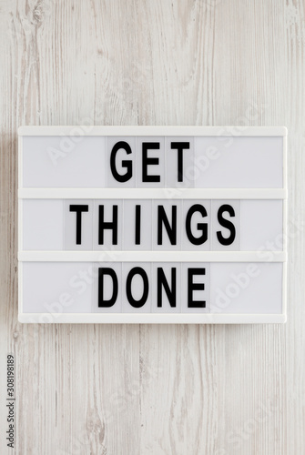 'Get things done' words on a lightbox on a white wooden surface, top view. Overhead, from above, flat lay.