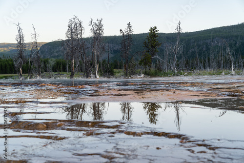 Geyser and hot spring reflection in the Black Sand Basin area of Yellowstone National park, at dusk