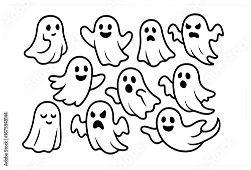 Ghost expressions linear icon set. featuring happy, scared, sleepy, surprised, and waving ghost symbols