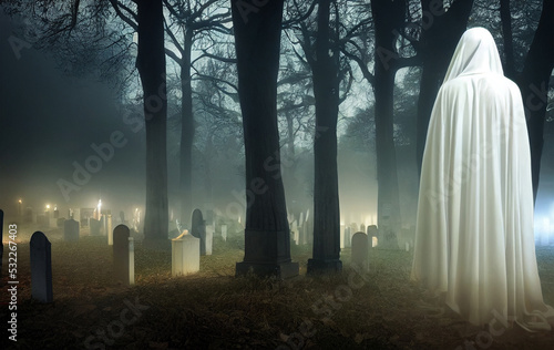 ghost walking in dark cemetery at night Halloween background
