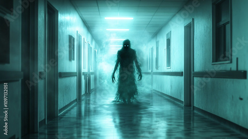 Ghost with glowing eyes wanders through a dark hospital corridor, creating a chilling and haunting atmosphere