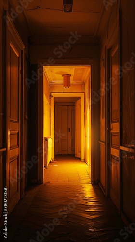 Ghostly activity, flickering lights in old hallway, panoramic, eerie, dim yellow glow , low noise