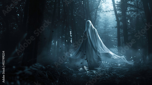 Ghostly Apparition. A haunting image of a translucent ghost floating in a dark forest.