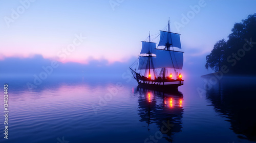 Ghostly Ship Sailing Through Misty Sunset Waters