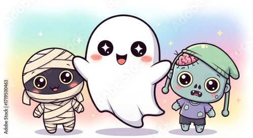 Ghosts, mummies, and zombies in a cute style with big eyes and friendly expressions. The popularity of kawaii culture and the juxtaposition of the terrifying and the cute.