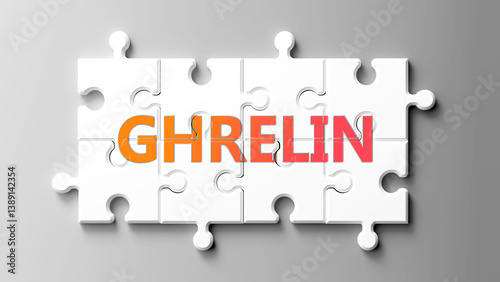 Ghrelin complex like a puzzle - pictured as word ghrelin on a puzzle pieces to show that ghrelin is complex and needs cooperating pieces that fit together. ,3d illustration