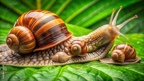 Giant African Land Snail & Baby Snails on Green Leaf - Macro Stock Photo