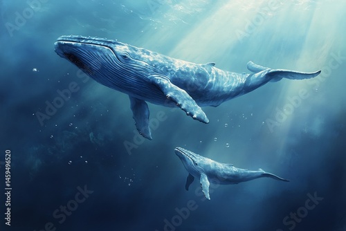 Giant blue whale calf swimming through a misty deep ocean with tiny plankton drifting no human no labelling no logo
