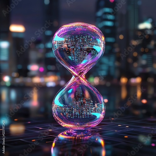 giant hourglas for business Hourglass, time, sand, measurement, deadline Futuristic hourglass in vibrant urban setting.