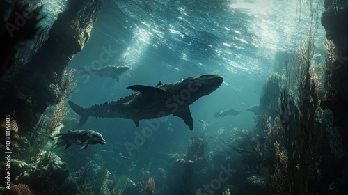 Giant marine reptiles swimming through a prehistoric ocean, surrounded by ancient fish species.