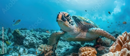 Giant sea turtle swimming over coral reefs, ocean wildlife habitat