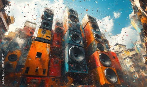 Giant speakers rise, confetti falls, urban scene.