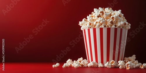Giant striped popcorn bucket overflowing with freshly popped popcorn on a bright red background
