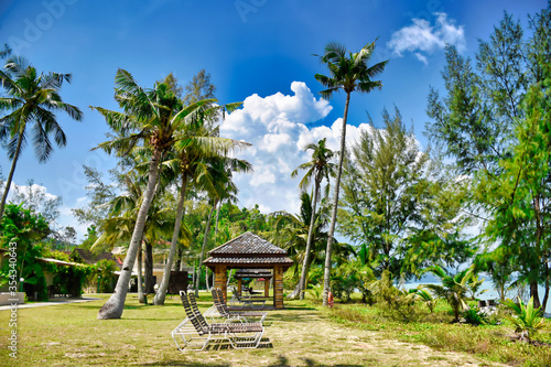 Giant stunning coconut palm tree with a massage hut and deck chairs under the beautiful blue sky on the shores of the sandy beautiful exotic and stunning Cenang beach in Langkawi island