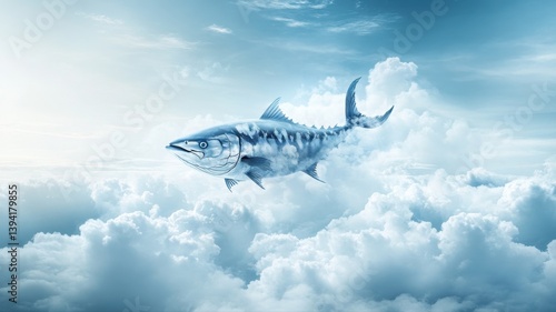Giant tuna swims gracefully through soft clouds in whimsical sky Generative AI