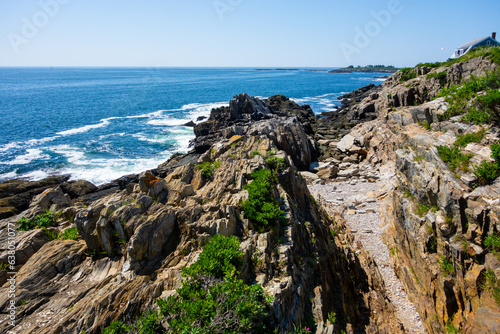 Giants Stairs trail on Bailey Island with views of Casco Bay. Photos of the rocky shoreline taken in summer on a clear blue day.