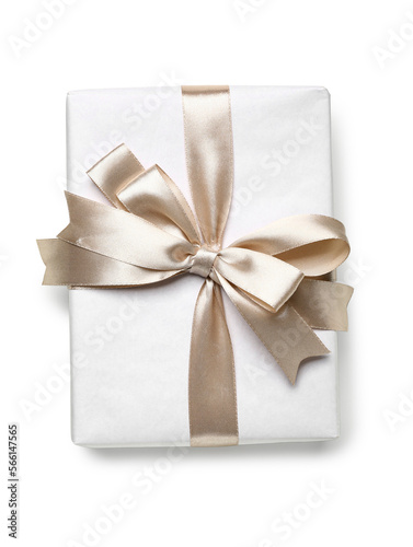 Gift box tied with shiny satin ribbon on white background