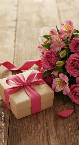 Gift Box with Ribbon and Flowers on Table – Mother's Day Present Scene