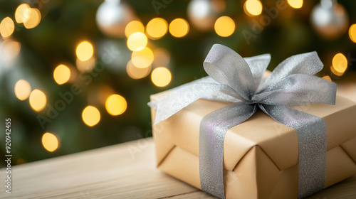 Gift box with silver bow against blurred Christmas lights. ..