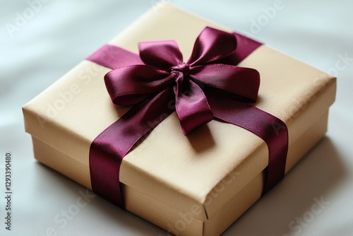 Gift box wrapped in elegant ribbon positioned on a smooth surface indoors during daylight hours
