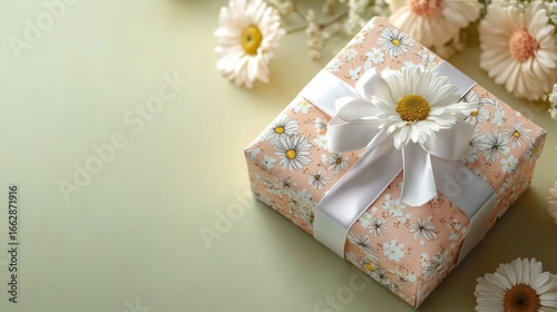 gift box wrapped in floral patterned paper with white satin ribbon and daisy flower on top surrounded by scattered daisies on pale green surface