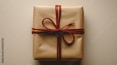 Gift box wrapped in kraft paper with red string bow on beige background.