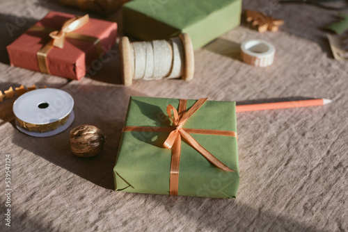 Gift boxes and decorations for wrapping on table. DIY Christmas decoration. Winter holidays, event celebration. Christmas tradition.