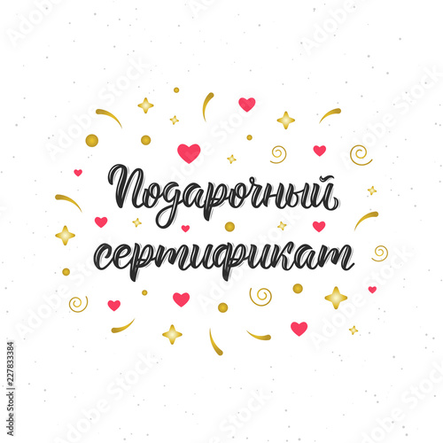 Gift Certificate. Trendy hand lettering quote in Russian with decorative elements, art print design. Cyrillic calligraphic quote in black ink. Vector
