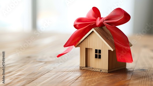 Gifting celebration - tiny house with red ribbon and bow, property surprise