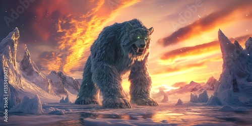 Gigantic stone bear dominates a fiery sunset over icy peaks. Epic fantasy landscape.