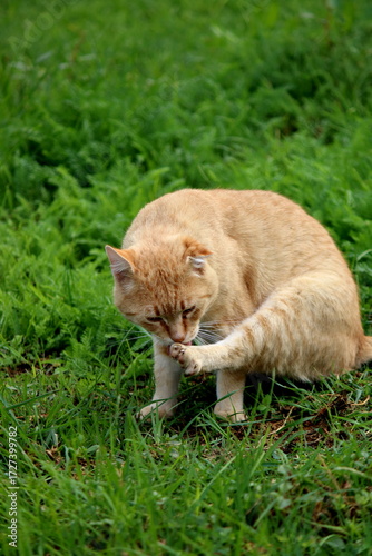 Ginger cat in the grass – playful and expressive moments-A ginger cat lying and playing in the grass, showing different moods and expressions. The cat is grooming, scratching, sticking out its tongue.
