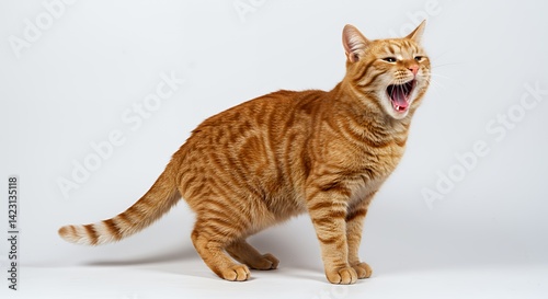 Ginger Cat Mid Yawn with Open Mouth and Visible Teeth Isolated on White Background a Cute and Expressive Feline Portrait