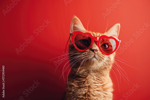 ginger cat wearing heart shaped red sunglasses, selfie like, red solid color background for Valentines. MZ