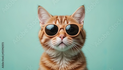 Ginger cat wearing sunglasses poses against a mint green backdrop.