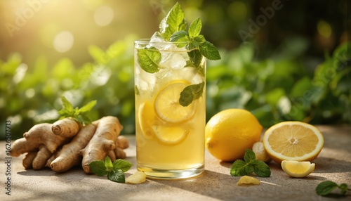 Ginger drink in glass on table with mint and lemon slices. Fresh ginger roots in sunlight, serene garden scene with rich green plants in background. Iced tea, refreshing, healthy, summer beverage.