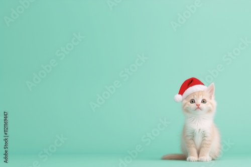 Ginger kitten in Santa hat on a solid light mint green studio background with copy space for text. Christmas banner, billboard, card, poster, postcard