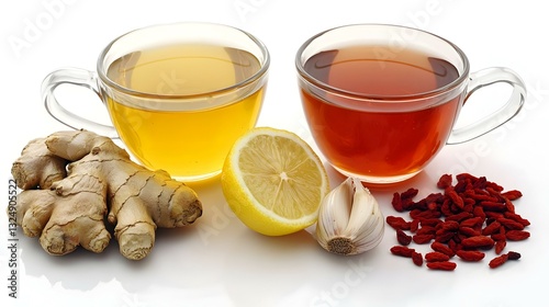 Ginger Lemon Garlic and Goji Berry Drinks isolated on white background