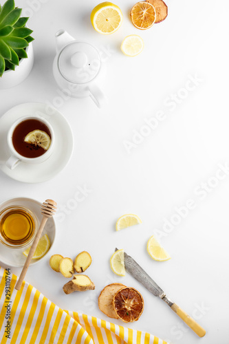 Ginger tea with lemon honey hot autumn, winter drink white background with copy space flat lay.