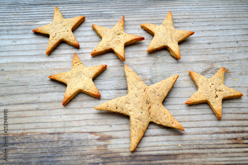 Gingerbread cookies in shapes of heart, star and man with cinnamon stick and ginger root on wooden table