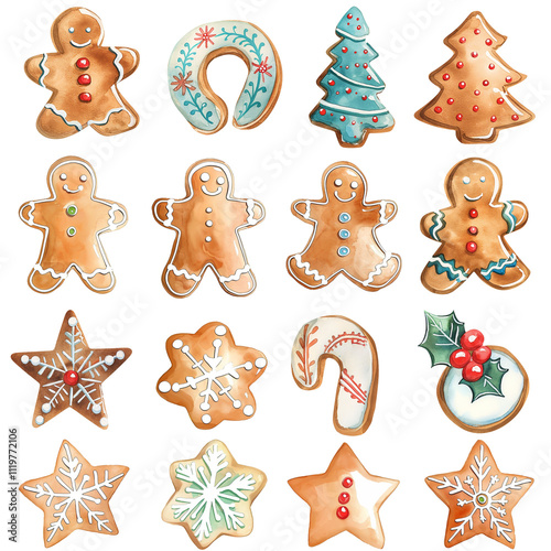 Gingerbread festive coocies watercolor illustration set png isolated on transparent background