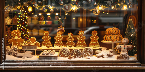Gingerbread figures in snowy shop window display glowing with warm golden light creating festive nostalgic Christmas ambiance
