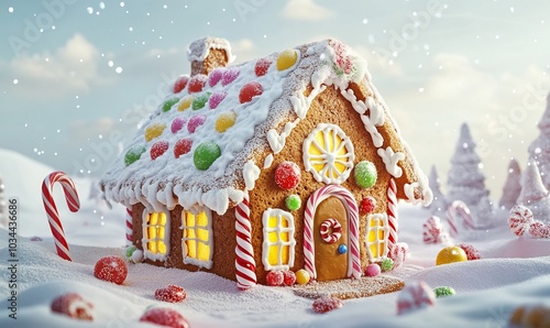 Gingerbread house decorated with icing, candy canes, gumdrops, and other colorful sweets, surrounded by powdered sugar snow
