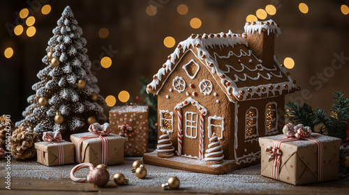 Gingerbread house toy set next to small holiday presents