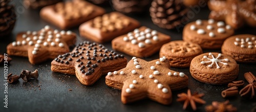 Gingerbread star cookies decorated with icing and spices on a dark tabletop creating a festive Christmas atmosphere