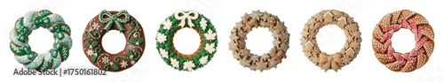Gingerbread wreath set including snowflakes, bows, berries, and cookie shapes isolated. Festive holiday and Christmas collection.