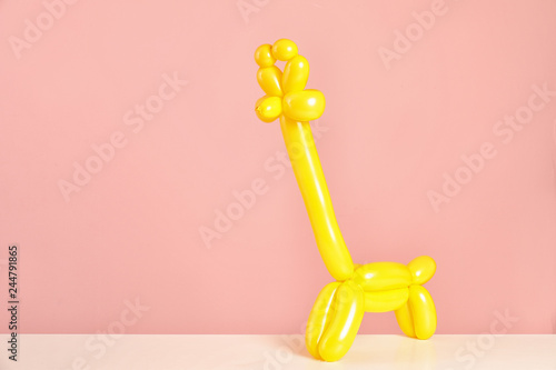 Giraffe figure made of modelling balloon on table against color background. Space for text