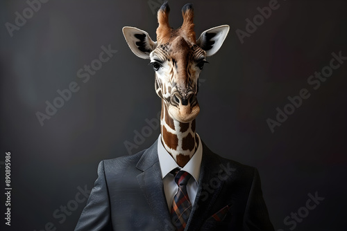 Giraffe in a business suit exuding confidence, ideal for creative branding, quirky marketing campaigns, or corporate diversity themes. Perfect for copy space.